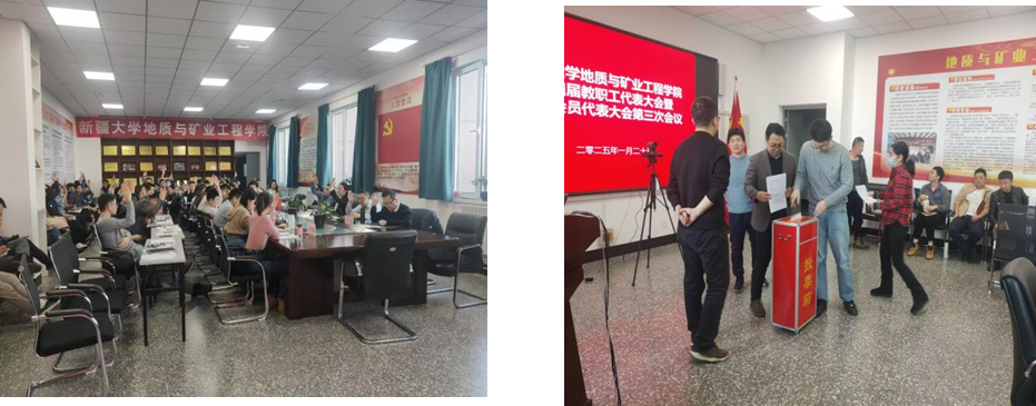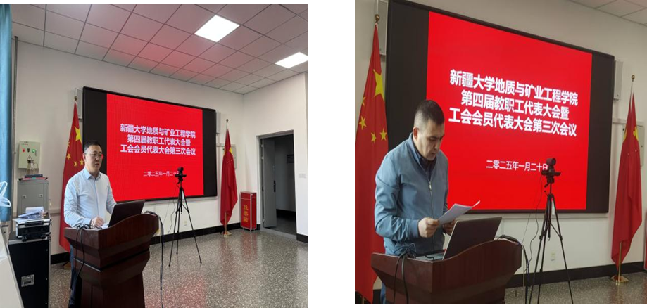 大会在庄严的国歌声中拉开帷幕。 学院党委副书记、院长张紫昭作 2024 年学院工作报告、 2024 年学院财务工作报告。张紫昭院长 全面总结了过去一年学院在党的建设、人才培养、教育教学、学术科研等工作中取得的突出成绩,分析了当前工作中存在的问题和不足,指明了学院未来发展方向。学院党委副书记、纪委书记阿地力·多力坤 作 2024 年学院工会工作报告。 阿地力·多力坤副书记向大会汇报了 2024 年度工会工作开展情况、工会会员参加各项活动取得的成绩及学院工会经费使用情况,并就下一年度工会重点工作做了说明。 2024 年学院工作报告、学院财务工作报告、学院工会工作报告等 3 个报告 经全体参会教职工审议,一致通过。